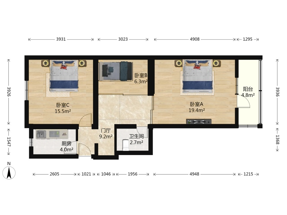 此房是东西朝向两居改三居室,业主把客厅改成次卧室,利用起来相当合理。