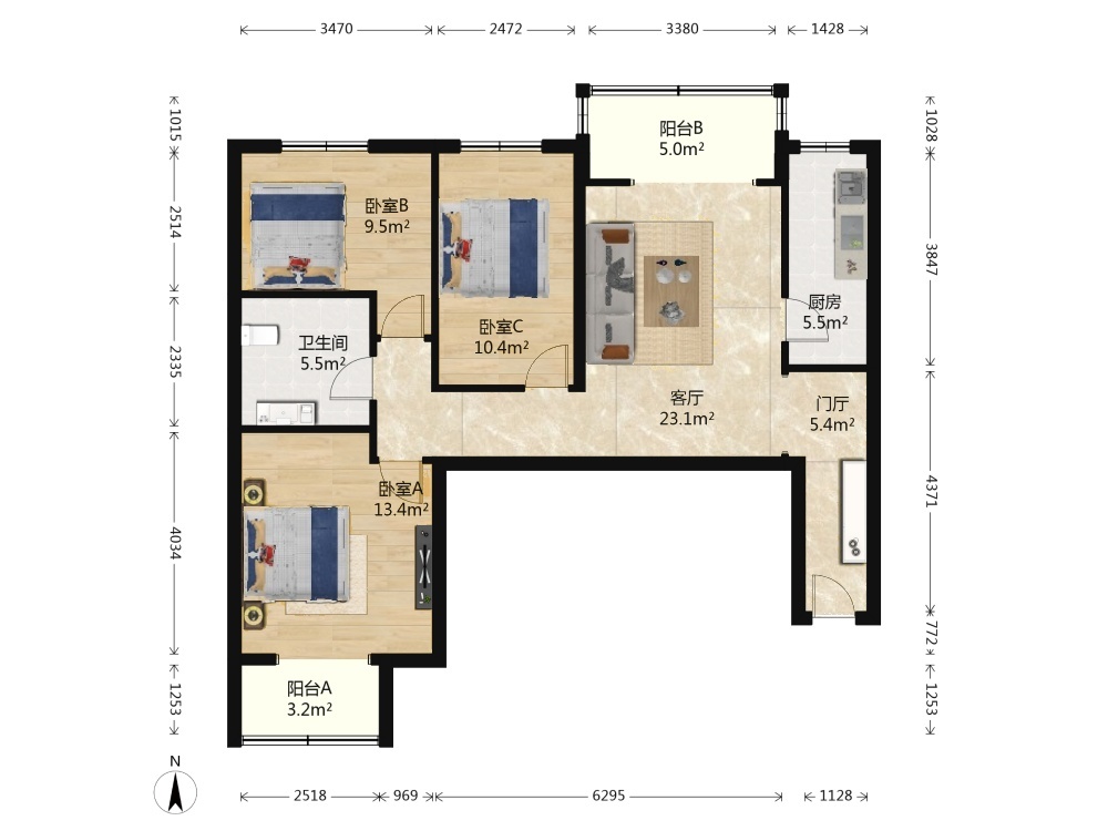 房子是三居室格局,大卧室朝南向带阳台,客厅和两个小卧室朝北向,其中客厅带阳台。房子整体面宽宽,方便家具摆放。厨房带窗户,保证了厨房采光和通风,烹饪时油烟不会污染室内环境。卫生间干湿分离,提升了卫生间使用率。房子装修保持的挺不错,干净整洁。