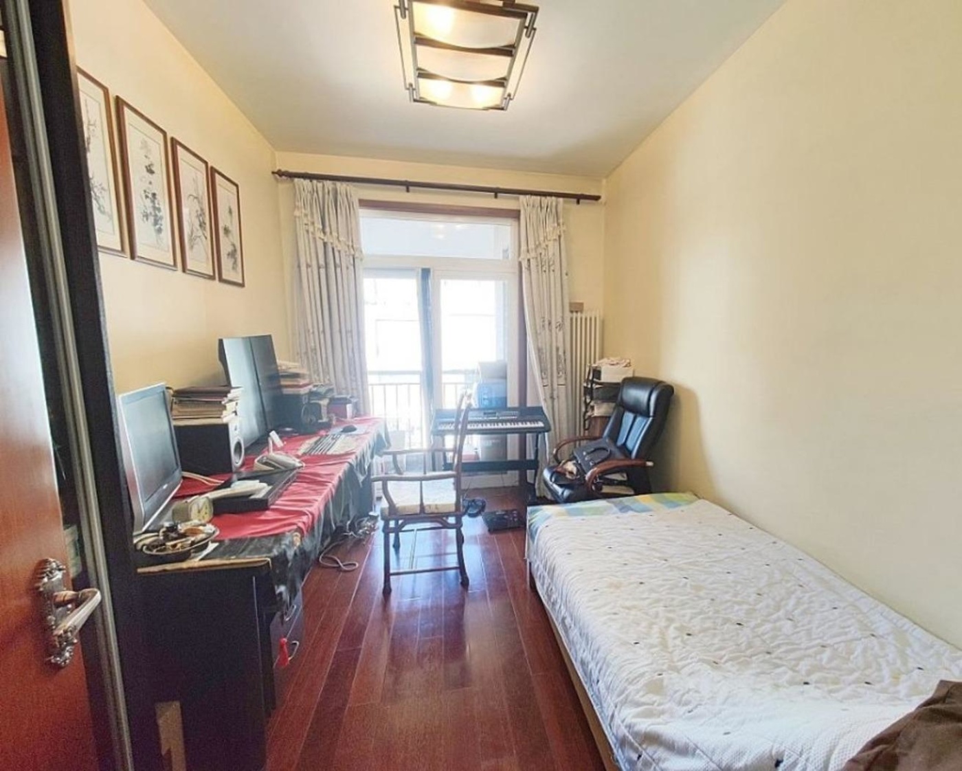 所售房源为南北通透三居室,进门直走到厨房,厨房有朝东的阳台,往东走到客厅有朝南窗户,一间卧室朝南,两间卧室朝东,朝东卧室正对花园,视野开阔,没有遮挡。