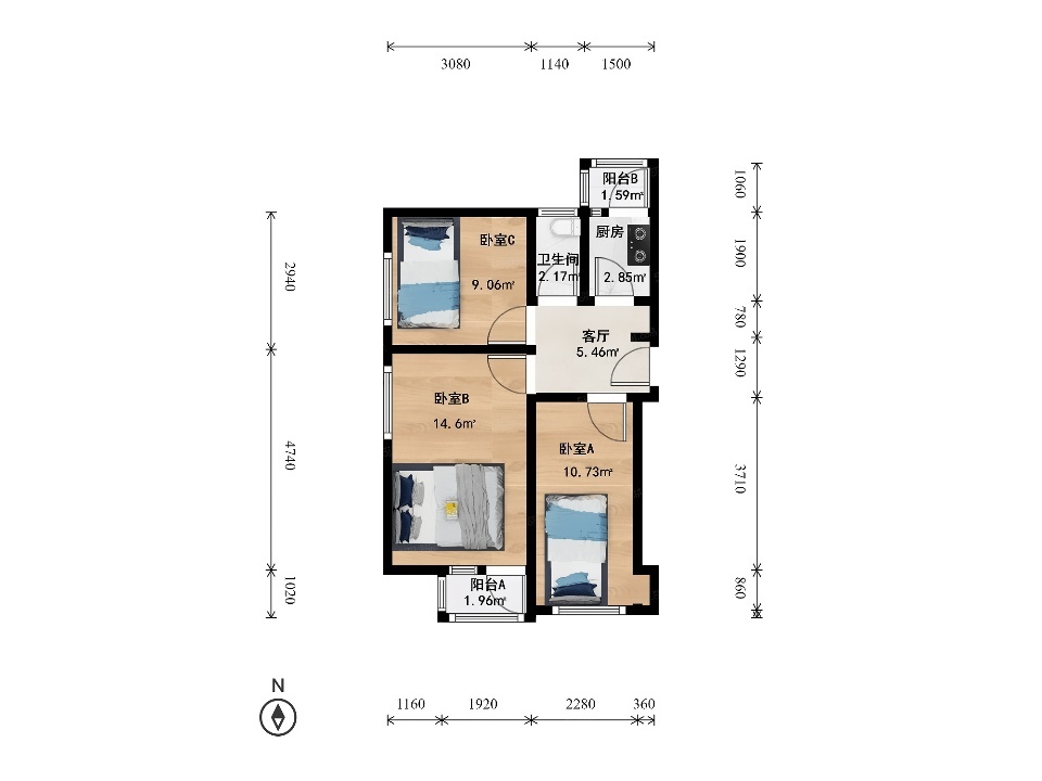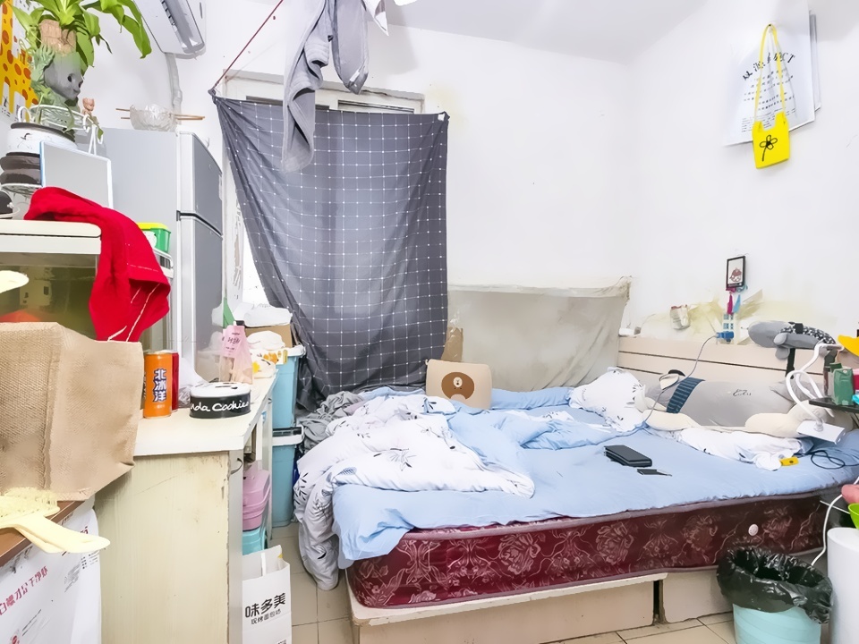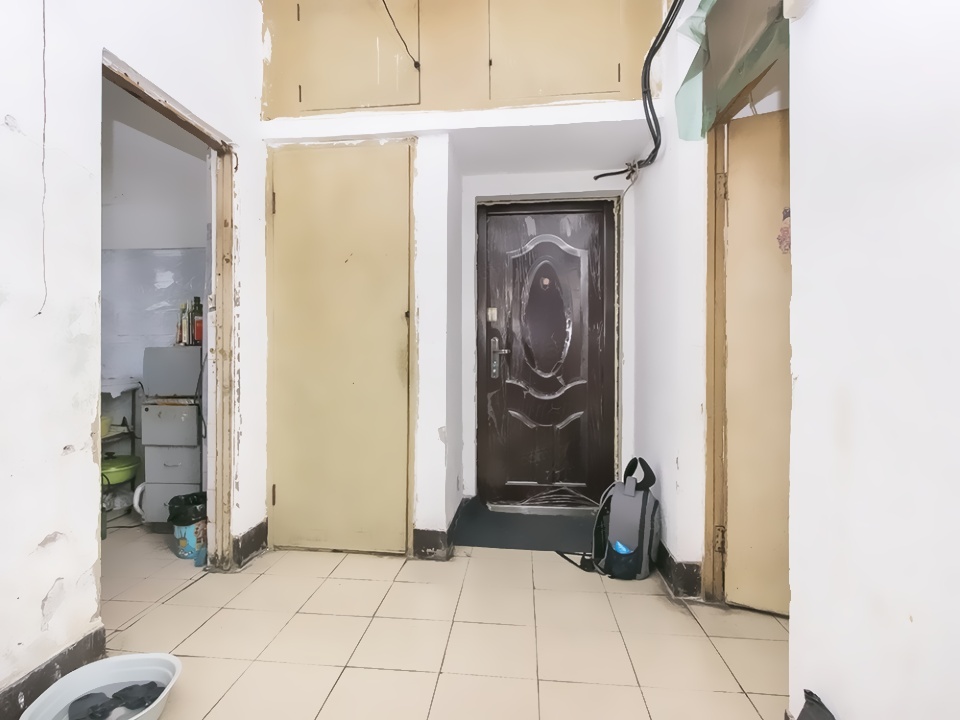 此房为西南北向3室1厅1卫,建筑面积为64.27平米,田字格户型南北通透挂西窗,进门是门厅,主卧室带阳台朝南,次卧室朝南,小卧室朝西,厨房朝北带阳台,卫生间朝北,简单装修,户型方正。