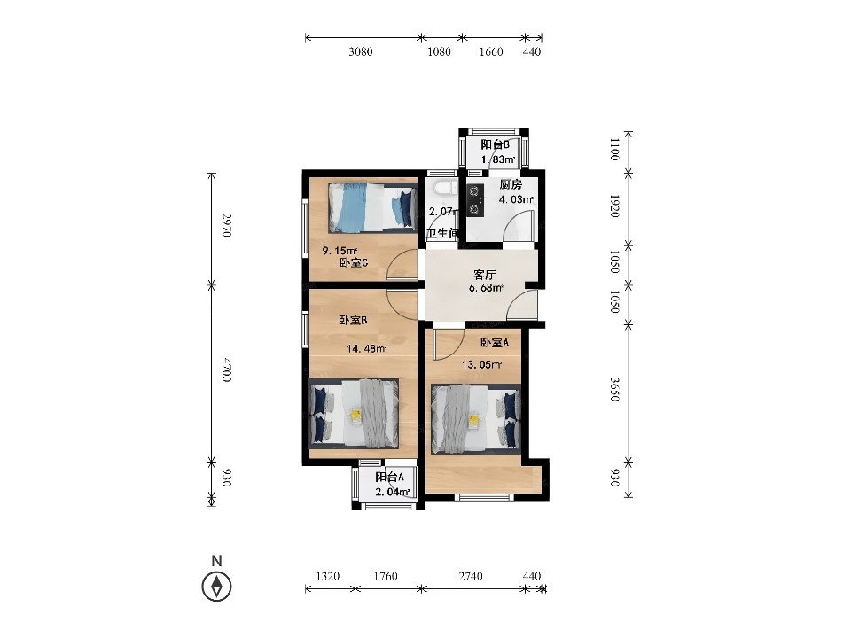 此房为西南北向3室1厅1厨1卫2阳,建筑面积为63.79平米,两个卧室朝南,次卧、厨房、卫生间朝北,户型方正,无浪费面积
