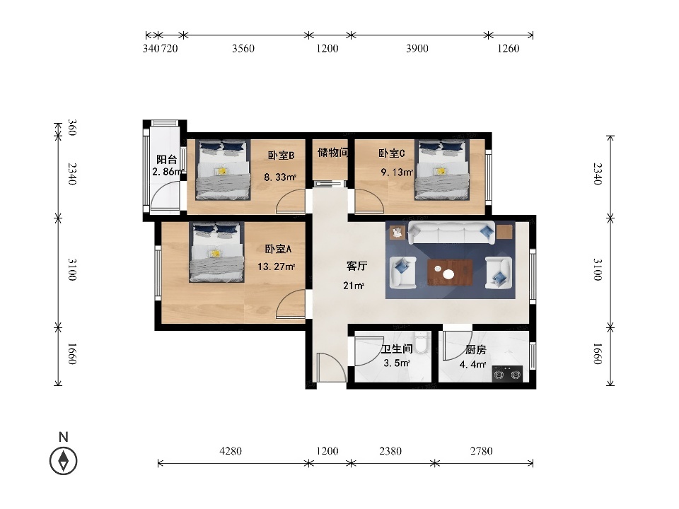 此房为东西向3室1厅1厨1卫1阳,建筑面积为85.85平米,东西通透 三居室,其中客厅面积约21.3平朝东,主卧室13.1平朝西,客厅主卧东西通透,另2间次卧面积分别是10.6平和9.3平,也是东西通透,卫生间3.6平,厨房朝东4.5平,户型方正,没有浪费