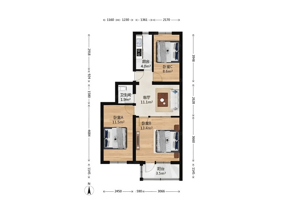 此房为南北向3室1厅1厨1卫1阳,建筑面积为70.07平米,南纬路南巷,南北三居,房子方正,其中两间卧室朝南,一间卧室朝北,中间是客厅,采光好,无任何浪费面积,使用率高。