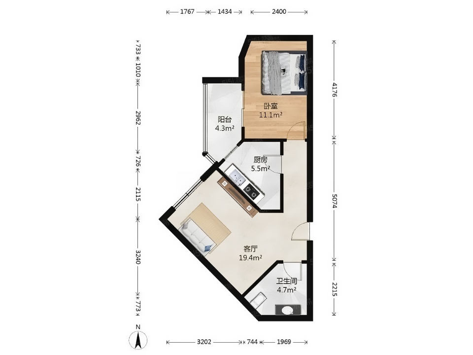 此房为天桥北里一号楼电梯直达一居是,房子面积60.79平米,正规的一室一厅。