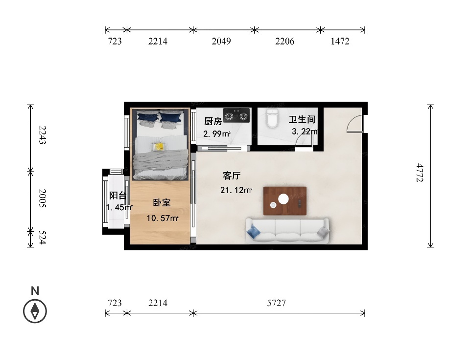 此房为西向1室1厅1卫,建筑面积为57.84平米,一个餐厅,客厅较大,适合一家人用餐及活动区域,落地阳台,采光好无遮挡。