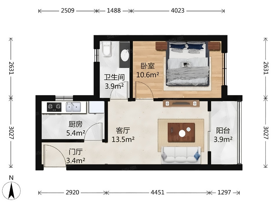 此房为东向一居室,面积55.13平米,进门开放式厨房,厨房朝北,卫生间朝西,客厅朝东带阳台,主卧室朝东。