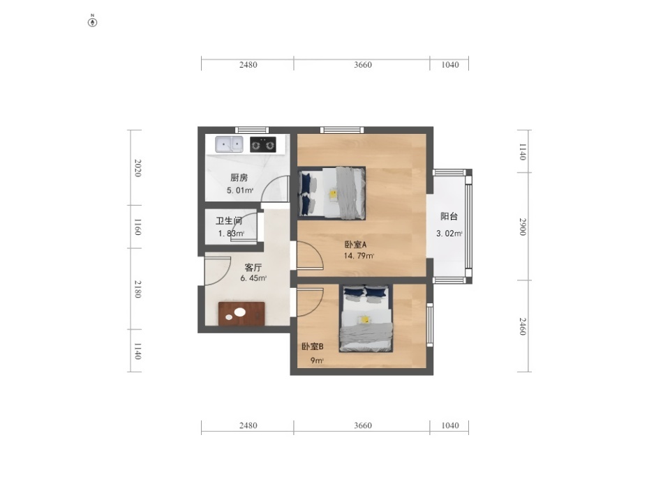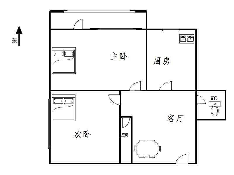 主卧次卧都朝东,主卧带阳台有个朝北的窗户,格局舒服,没什么浪费面积。