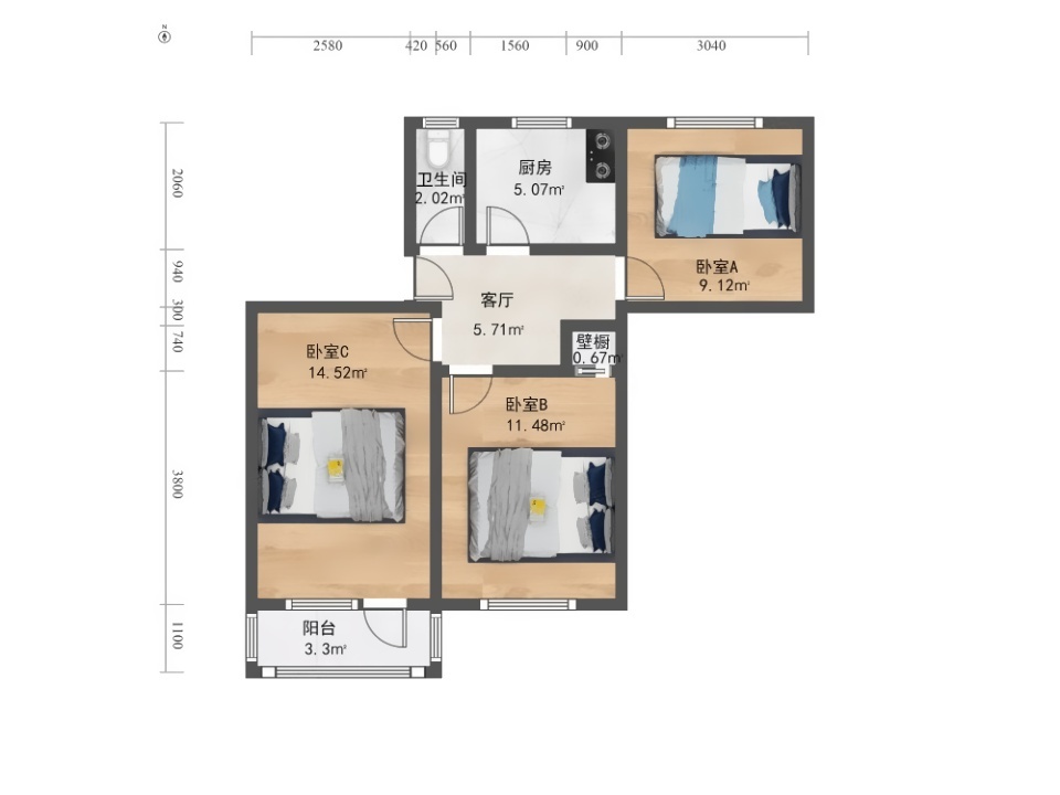 此房为正规的南北三居室。楼层在中高层,采光和通风非常好。