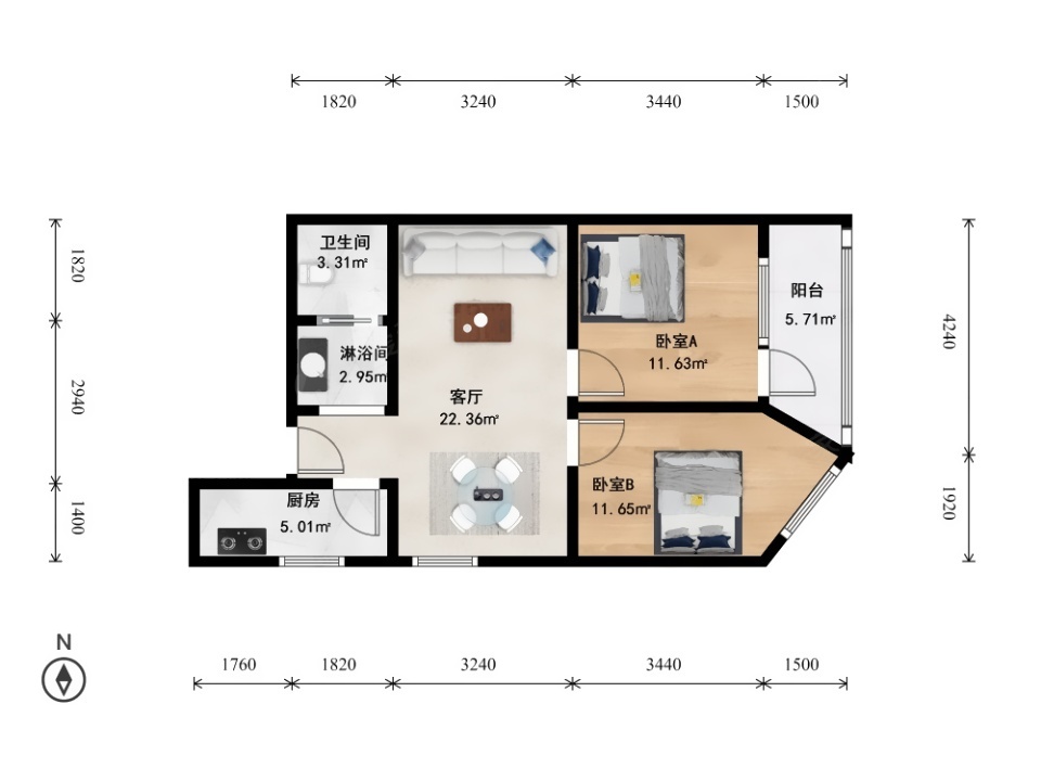 此房是正规的两居室户型,进入客厅是厨房带明窗,利于油烟的及时排出;一侧是卫生间,干湿分离,干燥整洁;客厅方方正正,摆放家具家电比较合理;次卧室带窗户,可以满足室内的采光需求;主卧带阳