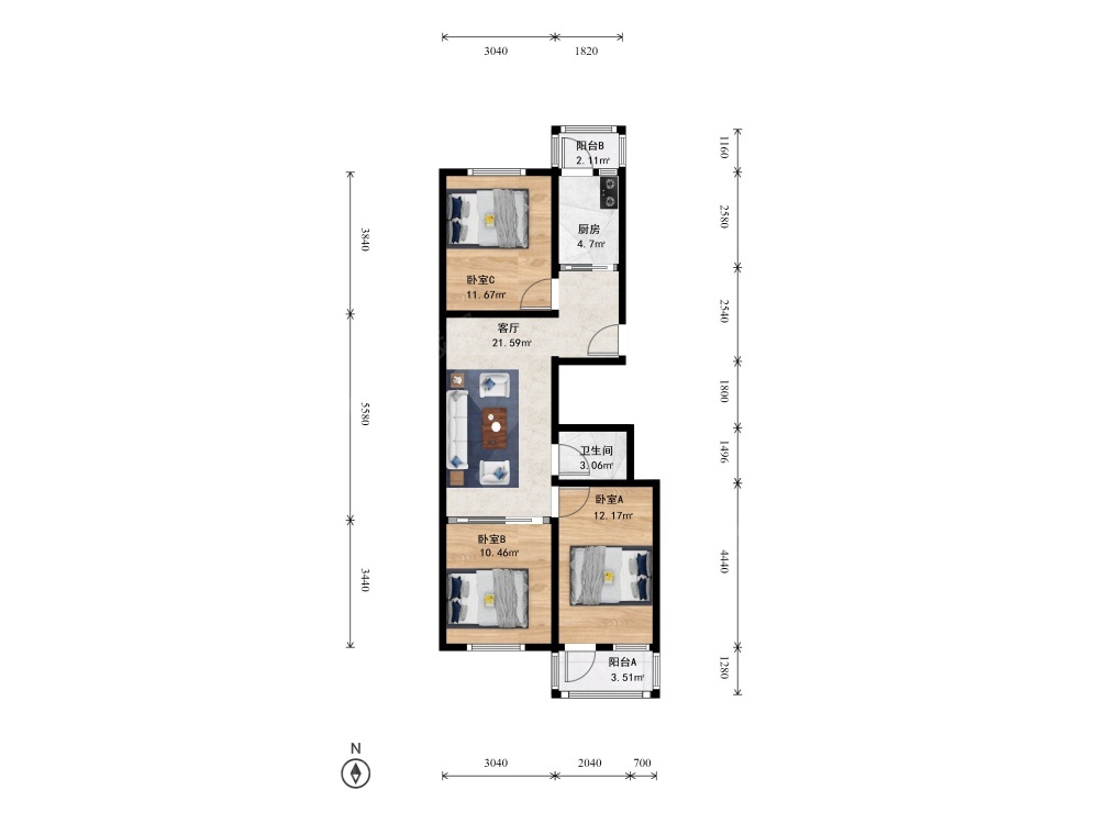 此房为南向3室1厅1卫,建筑面积为84.98平米,无浪费面积